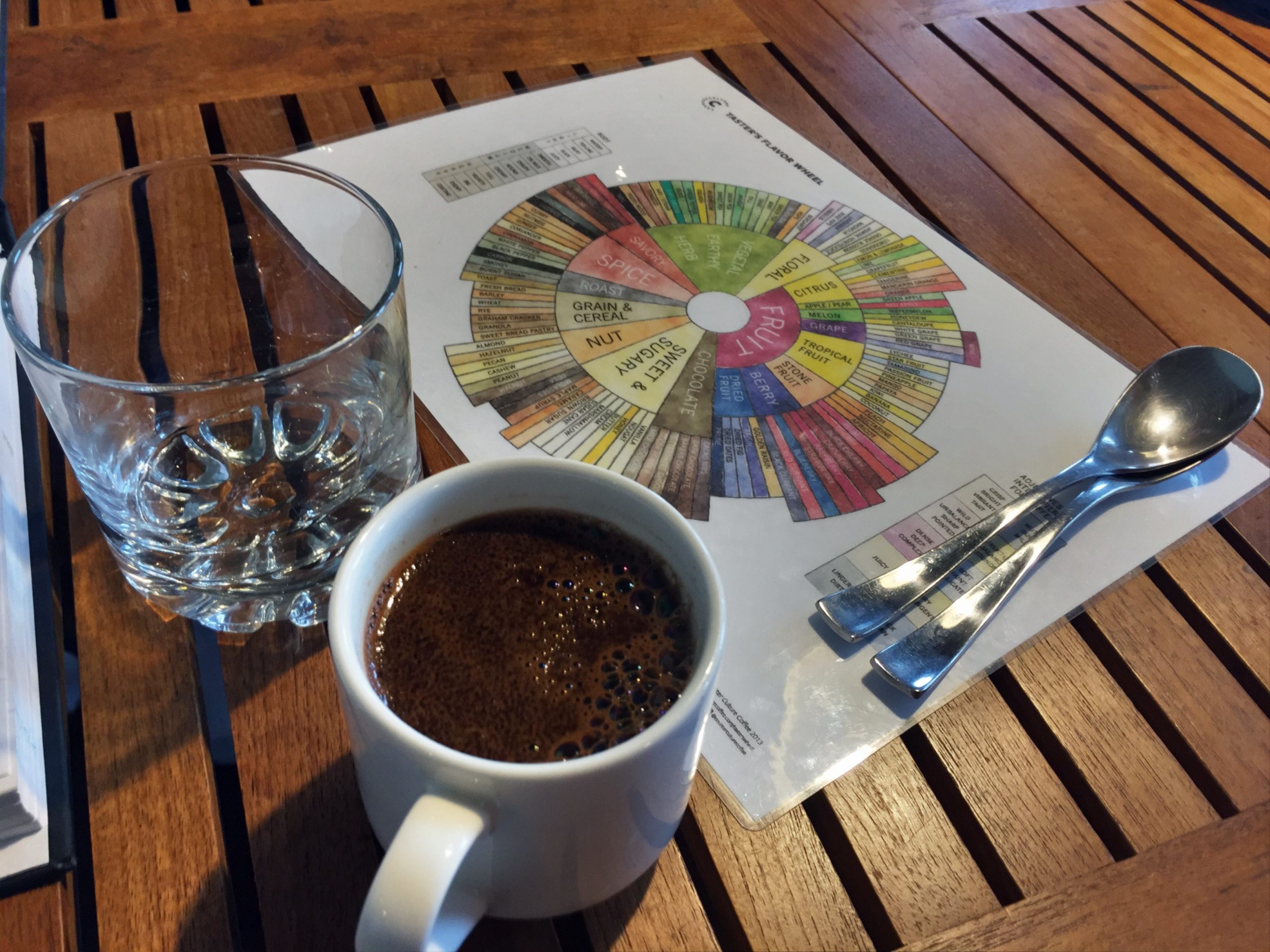 Freshly-brewed Galapagos coffee and a tasting wheel to guide us through our tasting. © WWF-US/Collin Lawson