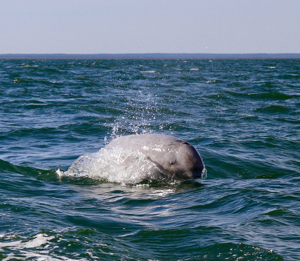 We bump along the surface of the water. Hundreds of beluga whales are at the mouth of the Churchill River, which empties into the enormous Hudson Bay. There are many pairs of mothers and babies in the water. Pods of big white males approach from behind the wake of our Zodiac. There is a 360-degree view of white whales in the waves. It is hard to decide which beluga to focus on with my camera! My best photo is of a slate-gray baby spy hopping next to its mother’s white tail fluke.