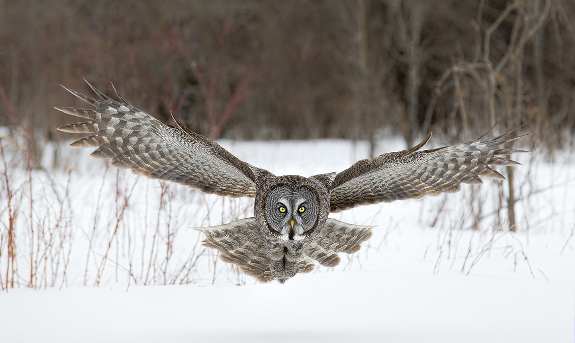 Photographer Tin Sang Chan snapped the moment a great gray owl soared over the snowy landscape.